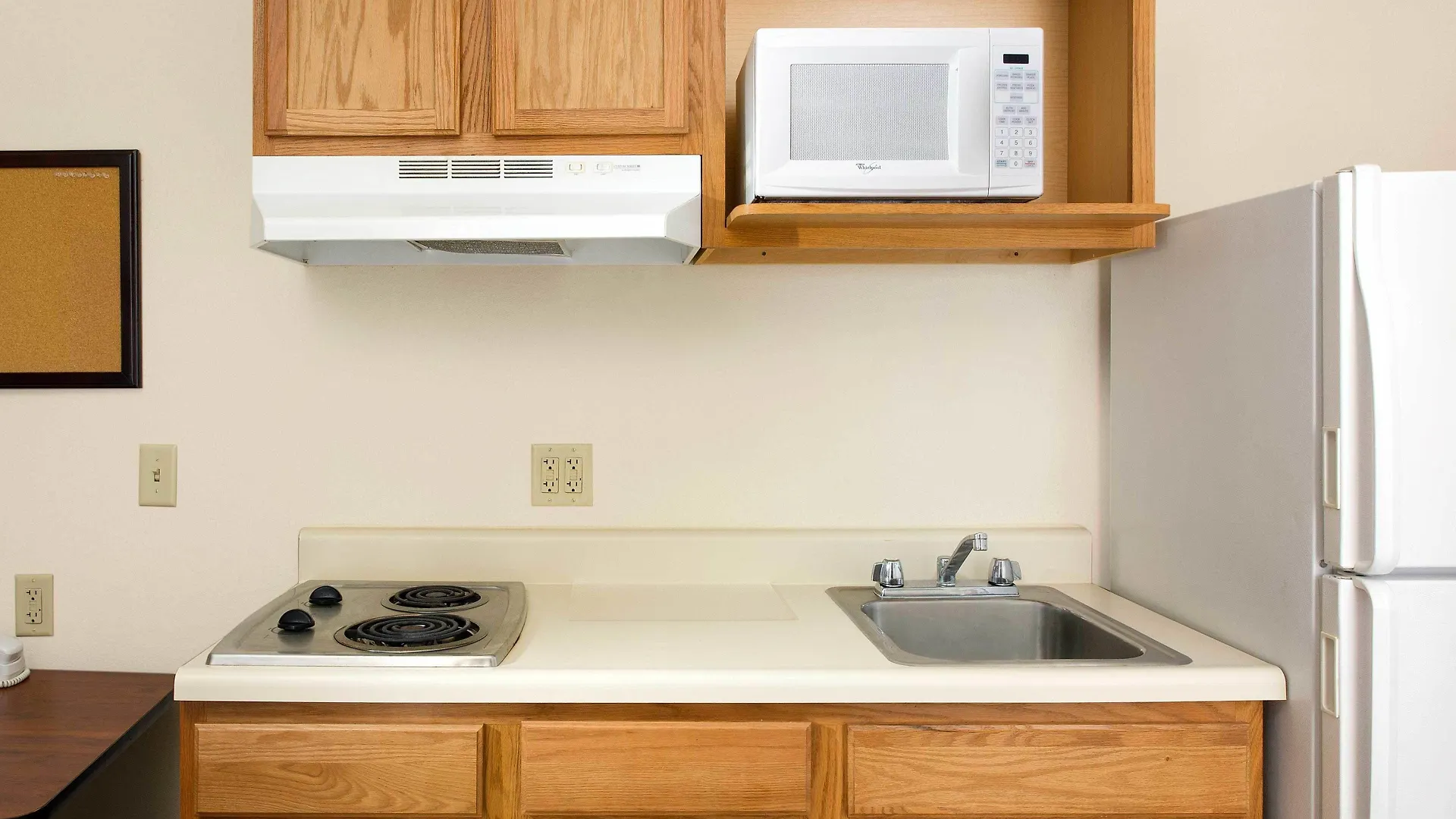 A microwave, a full-sized refrigerator, and a cooktop are provided in certain rooms.